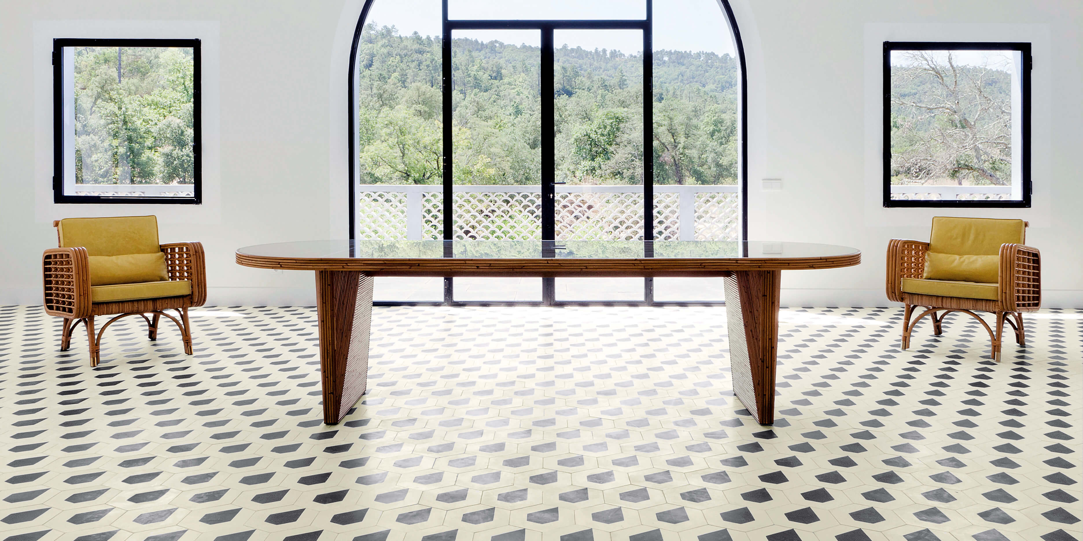 Cementine Fliesen eignen sich für Rückwände, Böden in offenen Wohnküchen oder als „Teppich“-Element unter dem Esstisch. Die matte Oberfläche wirkt wohnlich und ist rutschfest.