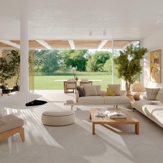AUS DER NEUEN NEUAUSLEGUNG DES SIZILIANISCHEN STEINS ENTSTEHT EINE SERIE VON MATERISCHEN UND DYNAMISCHEN STEINEN, IDEAL FÜR INNEN- UND AUßENBEREICHE, IN DEN FARBEN WEISS, GRAU UND BEIGE.